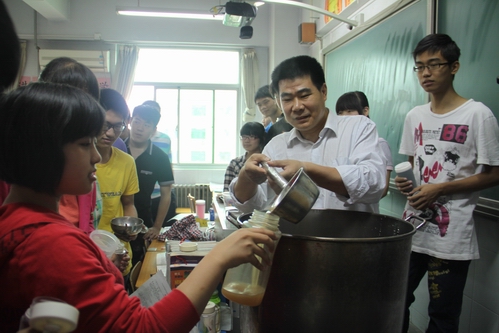 班主任罗斐老师在教室为同学们舀盛解暑的绿豆水