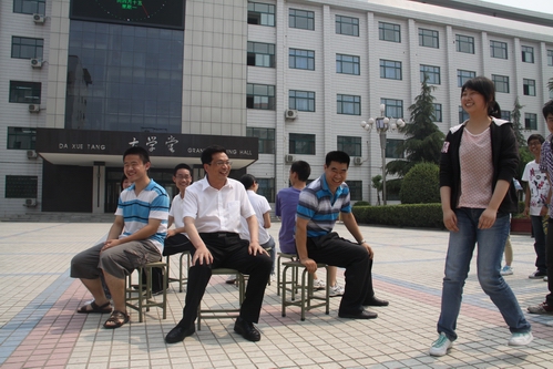 郑州19中校长梁寅峰和高三年级的学生们利用课间活动时间做抢凳子的游戏进行减压