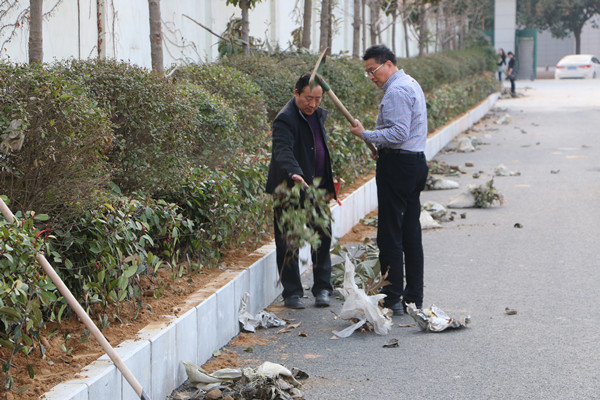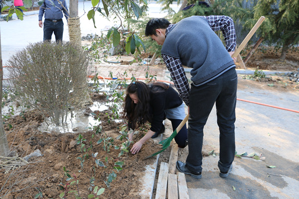 老师们分工明确,互相协作。男老师负责挖树坑,女老师负责运树苗、栽树苗,迎着春风,老师们干得热火朝天。不少平时连锄头都没有摸过的老师,此刻却有板有眼地当起了“园艺师”。植树活动中,有的老师衣服弄脏了也浑然不顾,植树的热情丝毫不受影响。该校梁寅峰校长也来到植树现场,向青年教师传授植树技巧!虽然大家脚下手上全是泥土,但眼前一片新生的春意让大家满心欢喜。
