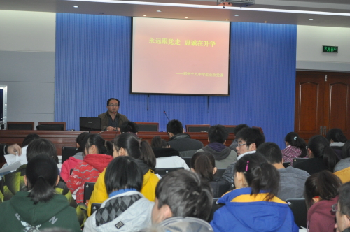 为进一步加强郑州市第十九中学学生政治思想建设,构建和谐校园,帮助学生入党积极分子端正入党动机,坚定入党信念,提高政治素质和理论水平,使之具有共产主义的思想觉悟,2011年11月30日下午,学校党委组织进行了学生业余党课培训学习,来自高中部的65名入党积极分子,在办公楼一楼会议室参加此次培训。