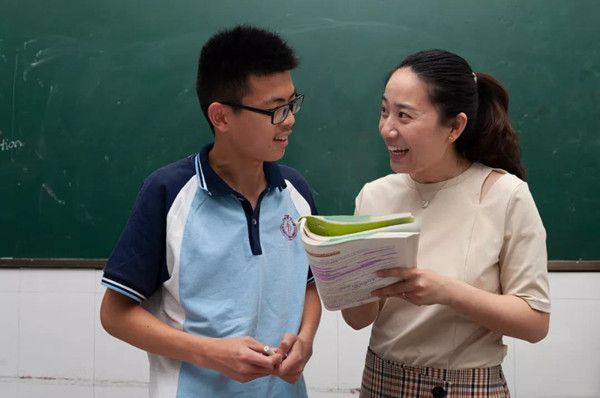 荣获全国英语教师基本功大赛一等奖的张冲老师在和学生交流