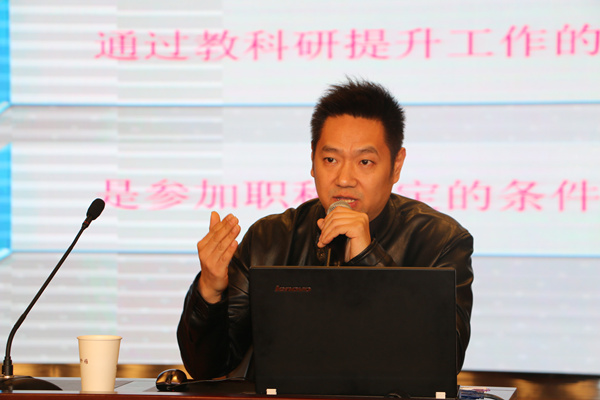 王旸老师首先从教科研的意义谈起,以一则幽默的小故事引出了教师进行课题研究的必要性。他强调,一名优秀的教师不仅要有高超的教学水平,还应该有扎实的教科研能力。课题研究是教科研的重要表现形式,也是与每位老师个人发展密切相关的事情。之后,针对郑州19中教师现状,王旸老师着重向大家介绍了中教一级职称和副高级职称对教师教科研能力的要求。同时,王老师还根据多年的经验,向该校教师介绍了课题研究的具体方法和研究过程之中需要注意的步骤。