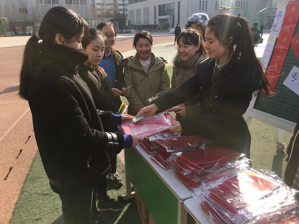 原来是该校学生会的成员们,他们在学生会主席程雯雨、团总支书记刘瑞堃的带领下,把自己排版、设计、印刷的近500副春联进行公益售卖,准备把所得的收益全部捐献给希望工程。学生会副主席段怡冰告诉记者:“春节是中国的传统佳节,每家每户都欢聚一堂,吃年夜饭、贴对联,喜气洋洋,但总会有那些偏远山区的同学们,他们没有暖气,食物匮乏,甚至没有像样的棉服,我们虽然不知道他们是谁,也不知道他们在哪,但我们想尽自己的绵薄之力,帮助他们,让他们过一个温暖的春节。”
