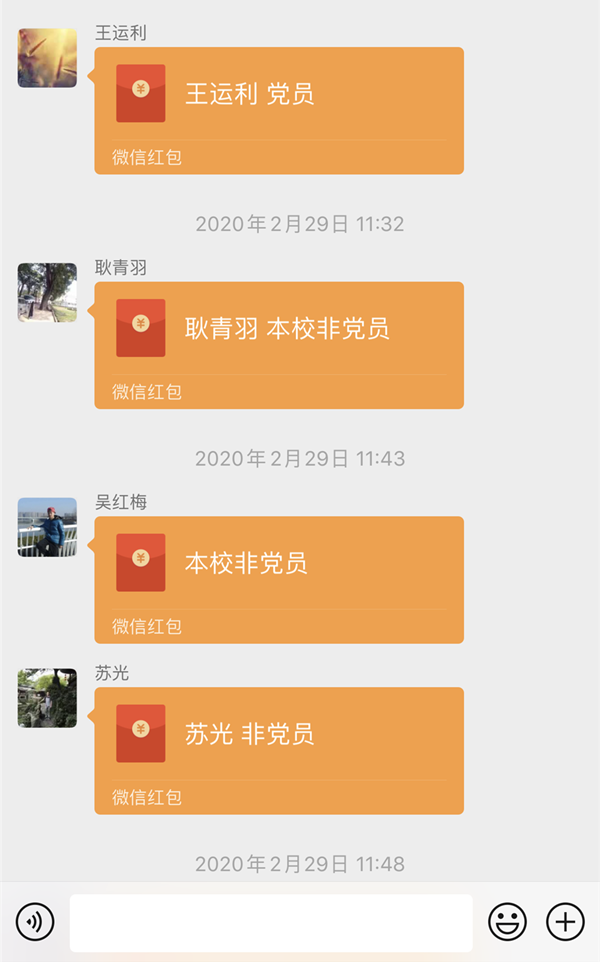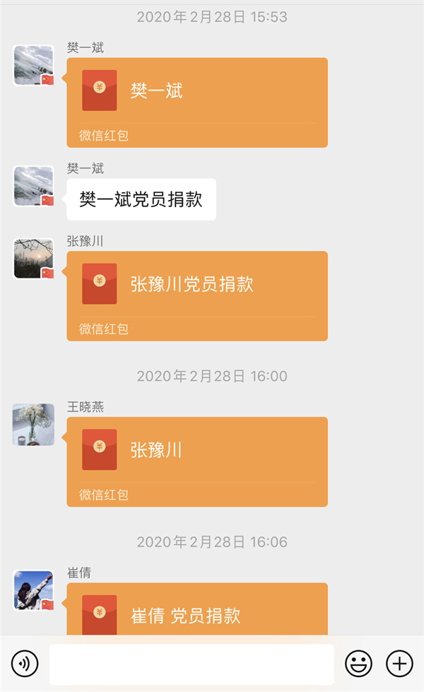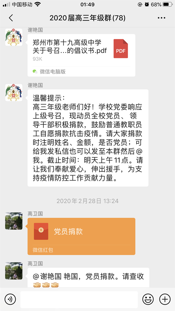 党号召,我行动!自愿捐款倡议刚刚发出,学校领导班子带头捐款,各处室、各年级、各支部的党员和非党员教职工也积极行动起来,因特殊时期,一笔笔承载着全体十九人打赢这场战争坚定决心的捐款以微信转账的形式交给了校党委。部分年事已高的离退休教师因使用老年手机没法微信转账而急地得团团转,最后硬是让子女通过添加支部书记的微信才成功捐款,着实让人感动;身体不适近期住院的李好老师(化名),因没有第一时间看到自愿捐款通知而错过了支部汇总的时间,最后李老师联系该校办公室才把自己的一份心意交给了党组织,这份看似迟来的捐款却透露出每一个十九人对党的忠诚与信任;去年刚入职的年轻老师,在微信群里说道:“目前虽然我还不是党员,但我也要捐款”,年级的微信群不仅因为老师们研讨线上教学热闹非凡,而且也因为大家想早点把爱心传递到抗击疫情需要的地方而变得更加热闹。截止到3月2日上午11:00共收到206名初、高中本校及离退休党员捐款,共计21188.13元,145名初、高中本校非党员老师捐款,合计14176元,两项合计35364.13元