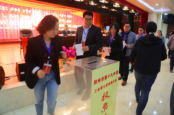 大会进行第二阶段议程。首先,郑州市教科文卫体副主任周帆宣读了郑州市总工会《关于郑州市第十九中学工会召开第七届会员代表大会的批复》。随后,郑州市第十九中学第六届工会主席董书仁做了工作报告。董主席从“是什么、做什么、怎么样”三个问题出发,丰富且幽默地汇报了工会开展的各项工作以及取得的傲人成绩。会场响起阵阵掌声,既是对工会工作的肯定,也是对工会工作的感动。接着,进行郑州市第十九中学第七届工会委员会的选举,本次选举采用无记名,差额选举的办法,最终选举产生了董书仁、余东洋、毛月琴等13名教师为新一届工会委员。会议结束后,新一届工会委员会将按照工会法和章程,依法进行等额选举产生新的工会主席。