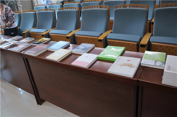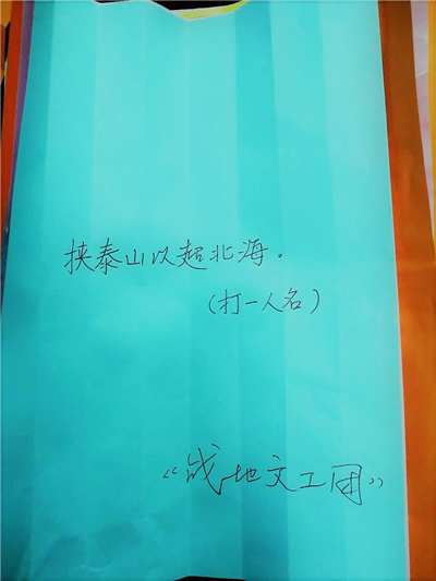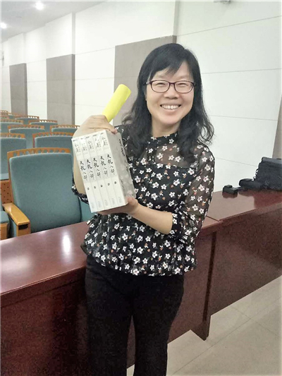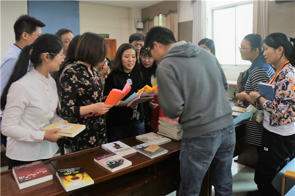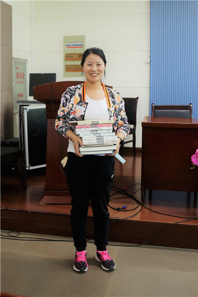 火热的抽奖现场,但可没这么简单哦 只有猜对谜语才能把奖品领走,快开动脑筋吧 大家都在围观猜谜王 大奖全套《天龙八部》被美丽与智慧并存的潘新宇老师领走 徐洁老师满载而归 2017年5月15日,在这个焦躁的初夏,让我们平静下来与心灵相约,在书籍之中寻找一份清凉的慰藉吧。下午15时,郑州十九中各个学科的教师齐聚一堂,八仙过海各显神通,开始了在智园楼东会议室里的切磋。一股书香在十九的校园中弥漫开来。 一本本精美的图书整齐的排列在桌上,等待有缘人来带走它们。到了最激动人心的抽奖环节,五颜六色的卡纸被卷成一个个纸筒插入篓中,老师们争先恐后,迫不及待的打开,绞尽脑汁的猜谜语。让我们来看看,题目有:“十个哥哥”打一个字、“古往今来”打一个人名、“挟泰山以超北海”打一人名……各位能猜到嘛? 这一场智慧与知识的较量在徐洁老师的满载而归中落下帷幕。哇!这么多书,够看两年吧!谁说女子不如男?女老师眼中那“我有你没有的小骄傲”让在座的男教师们分外眼红。 学无止境,老师更要如此。学海无涯苦作舟,舟很大,大到能载下所有的书籍;舟很小,小到只能装下一颗爱读书的心。