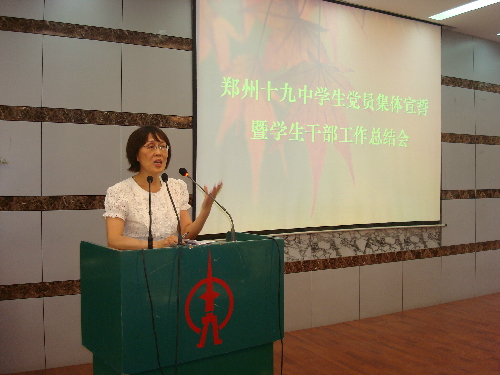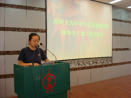 近几年,郑州十九中非常重视学生干部的培养和锻炼,尤其是学生党员的发展。学校创设了良好的条件,帮助他们快速成长,注重学生干部的自我教育,自我管理,自我发展。经过学校三年或六年的培养,高三年级9名同学不断成长成熟,顺利地从入党积极分子发展为中共预备党员。按照组织发展程序,今天进行学生党员集体宣誓仪式暨学生干部工作总结会,学校各级学生干部和入党积极分子参加了此次会议。