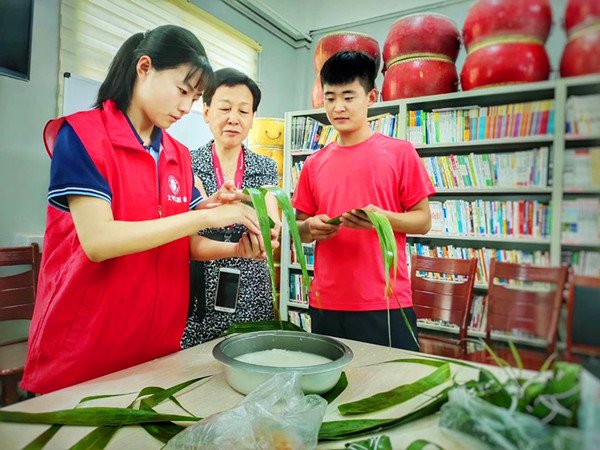 到达三棉东社区后,在社区工作人员的带领下,志愿者们来到社区老人家中,为老人送去粽子、食用油、大米,给老人带来节日的问候和温暖的关怀,老人们脸上露出了欢乐的笑容,向志愿者们表示感谢。炎炎夏日,那一抹抹红色的身影走家串户,传递着爱心和温情,受到社区工作人员和社区居民的高度赞扬。此外,社区工作人员还提前准备好了糯米、粽叶、花生、棉线,还专门安排了会包粽子的社区居民手把手教志愿者们包粽子:将粽叶折成漏斗形,在里面填满糯米、花生、红枣,然后裹粽子、扎线。青年志愿者们虚心地学习,也包出了有模有样的粽子,并且越来越熟练。载满爱心的小小粽子将送到社区的老年人、贫困户手中,给他们的端午节增添一份粽香,增添一份温暖。