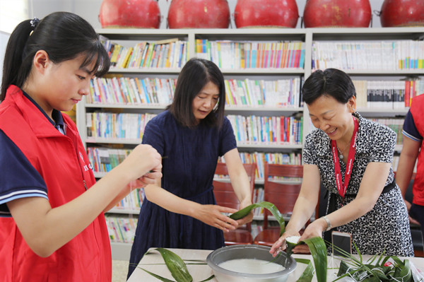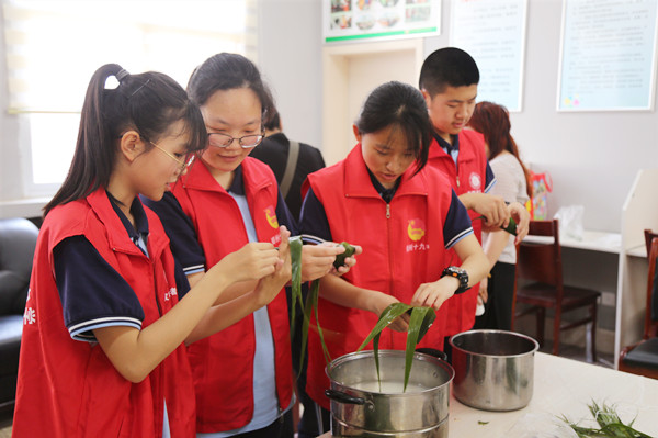 郑州19中党委副书记孙广兰(中)和社区工作人员、志愿者包粽子