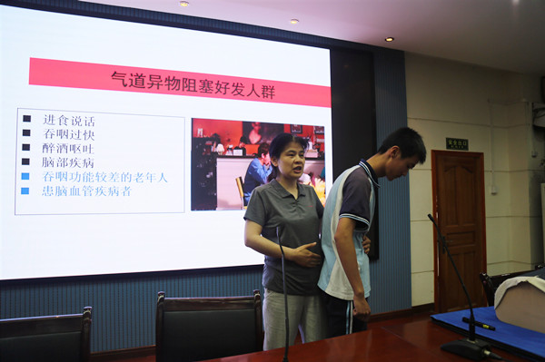 丁老师运用多媒体,给学生展示了实用的急救知识,包括急救的基本常识、心肺复苏技能、气道异物阻塞急救、抢救生命的绿色通道“生存链”及生活中发生常见意外事故的处理办法。通过现场模拟的方式,让学生上讲台动手参与,全面展示突发事故的现场救助流程。丁老师的讲解清晰明了、生动活泼,在轻松又不失严谨的氛围中,将专业的急救知识娓娓道来,既丰富了学生的急救知识,又传承了“救人救己、防患未然”的急救理念。最后,政教处副主任程宝义对本次讲座做出总结:“本次讲座,丰富了我们的救护知识,增强了我们的安全意识,提高了紧急情况下的救助能力,具有很强的现实意义 ”。