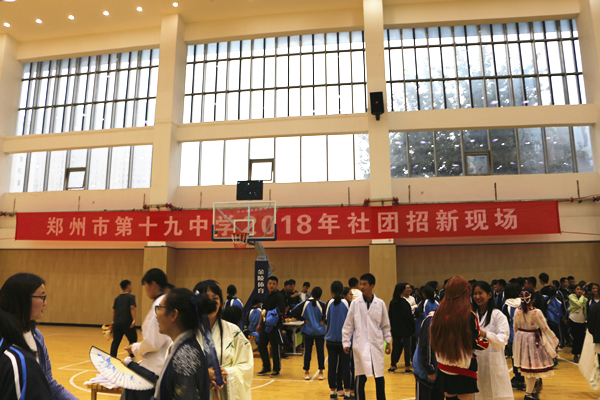 2018年9月19日,郑州19中在室内篮球馆进行了2018年学生社团集体招新活动,现场嘹亮的口号、精彩的展示吸引往来师生驻足观看和参与。与往年不同的是,本次招新部分社团采用线上扫码报名的方式,正式启用线上会员认证体系,为郑州19中学子提供更加便捷选择的同时,也为社团招新增添了新的亮点。