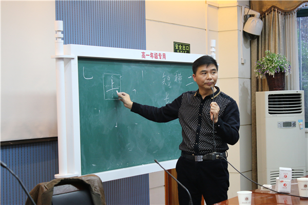 在不久前的月考中,谢艳国、王正兴等老师发现部分学生字体潦草、字迹不清,电脑阅卷会严重影响得分。对此,老师们心急如焚,想法设法鼓励同学们练字。而写一手漂亮美观的钢笔字,不仅仅需要恒心和毅力,名师指路更是起到举足轻重的作用。于是,学校邀请了张洪涛教授来我校给学生讲书法课。