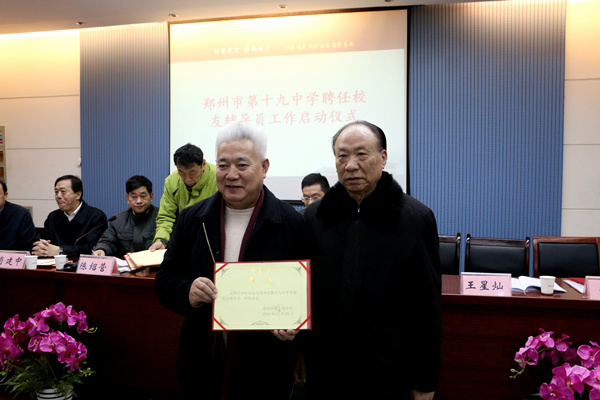 原郑州市副市长、郑州市关工委主任刘振中对郑州市第十九中学聘任校友辅导员工作启动仪式的顺利召开表示衷心的祝贺,并用一首打油诗表达了对该校未来发展前景的赞美:“励精图治伟业建,特色名校定实现。精英云集谋发展,前程似锦更灿烂。”随后,郑州十九中优秀校友、郑州古玩城董事长、郑州市第十九中学聘任校友辅导员工作组组长蒋继明进行了发言,表达了作为一名老十九人对母校的感恩之情,并对未来校友辅导员工作进行了展望。会议的最后,郑州市第十九中学聘任校友辅导员工作机构负责人向各位优秀校友颁发了聘书。