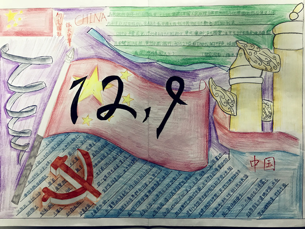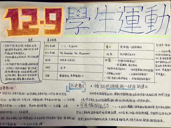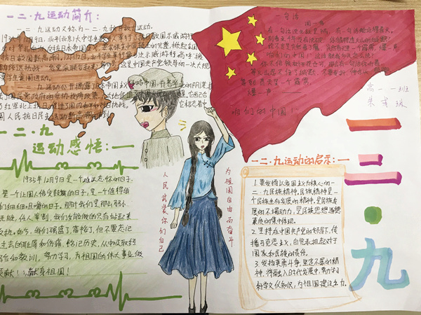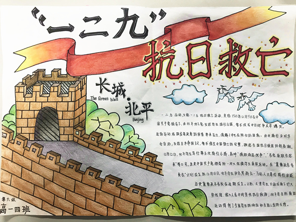 此次纪念活动主要以三种形式进行。其一是手抄报。经由校团委、政教处的积极倡导和各班宣传委员在班级内的热情宣传,学生纷纷通过各种途径查找相关历史资料,以增加对“一二·九”北平大中学生抗日救亡爱国运动的了解,在此基础上,充分发挥自己在文学、绘画等各方面的才能,在纸上描绘出了“我”心目中“一二·九”爱国运动。12月4日,学校对各班上交的手抄报进行了整理和筛选,将其中一部分张贴在校园里。一张张构思新颖、内容丰富的手抄报,成为该校校园里一道独特的风景线,吸引着全校师生们驻足、欣赏、品味和思索。