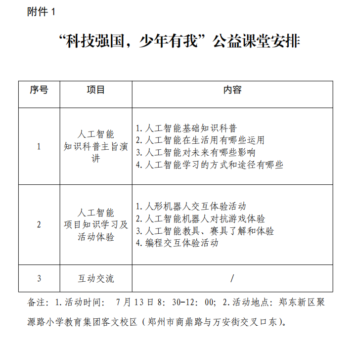 活动内容:围绕“人工智能基础知识、人工智能学习方式” 等内容开展主旨演讲、体验互动等活动(详见附件 1)。