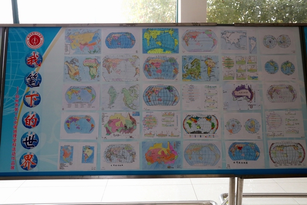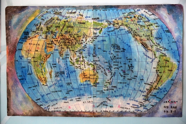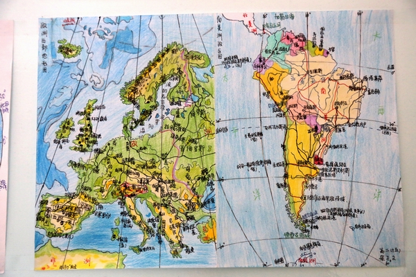 高二13、14、15、16班的学生们在“我笔下的世界”主题活动中,充分发挥自己的想象力和创意,四人一组,分工合作:有人画轮廓,有人着色调,有人设图例,有人加注记……在学习之余,课外活动时,欢声笑语中,用画笔描绘出了各类地图,有世界政区图、地形图、气候图还有区域性的局部地图和特色景观图,他们不仅学习了世界地理知识,更是展现给人们世界地图的多姿多彩,而且他们用地图诠释着这颗蓝色星球的美丽。