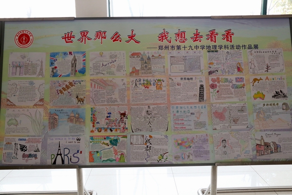 在郑州市第十九中学学科活动月期间,为了增添高二文科生学习世界地理的兴趣,丰富学生的课外文化生活,陶冶学生的情操, 2016年3月下旬,学校高二地理组分层次开展了“我笔下的世界”和“世界那么大,我想去看看”两个主题学科活动。