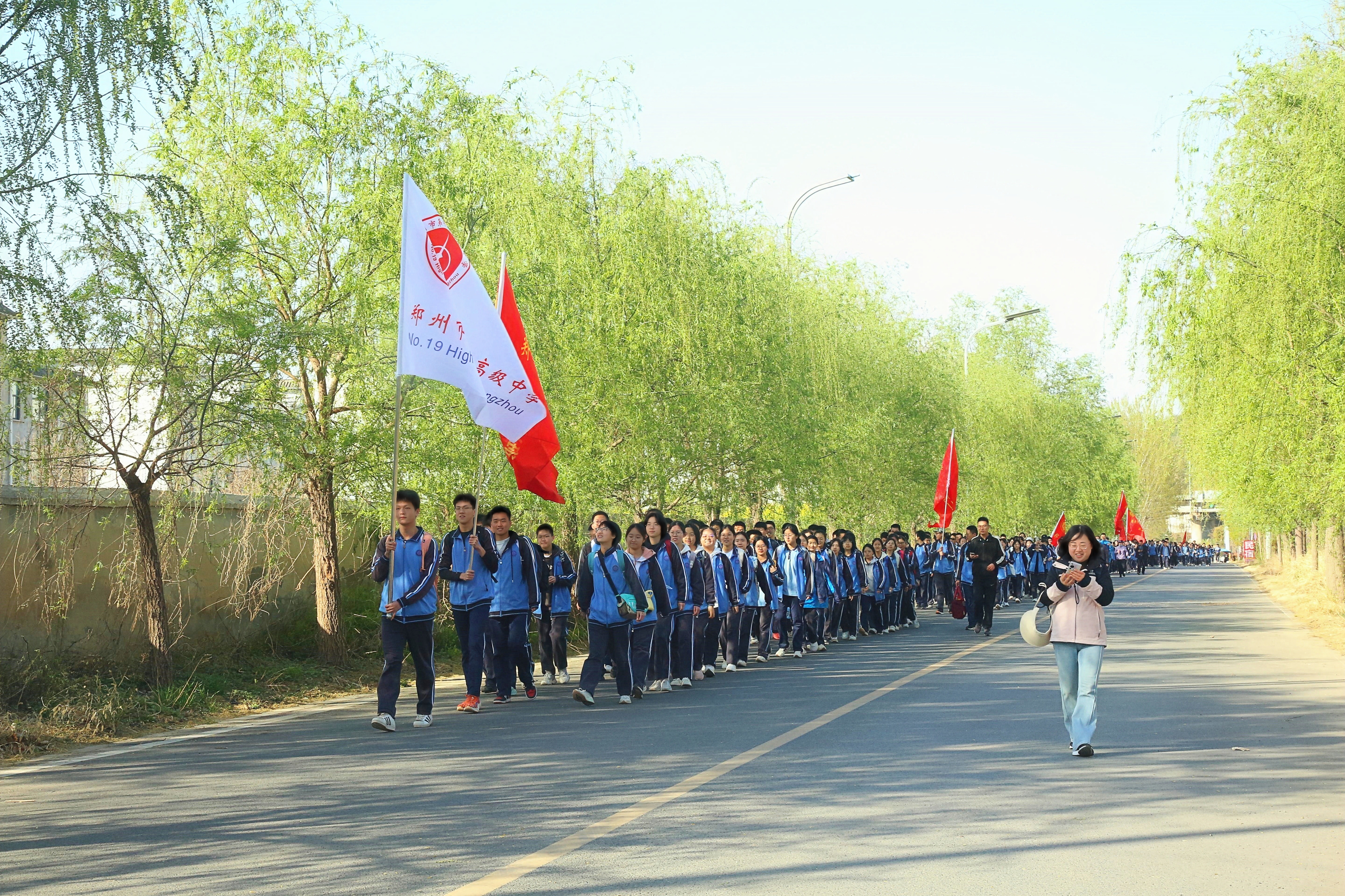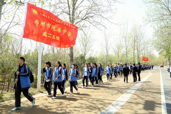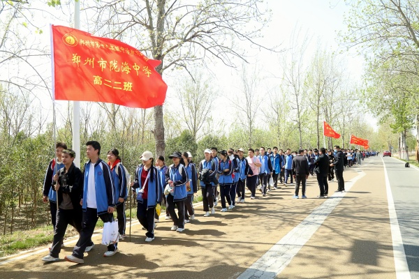 清晨7:10,陇海校区、工大校区学生身着整齐校服,在运动场以班级为单位组成两路纵队。陇海校区政教处副主任程宝义、工大校区教育教学负责人于潇展分别强调安全纪律,鼓励学生坚定信心,保持恒心和爱心,勇于挑战自我。随后,师生乘车前往江山路黄孚路公交站后,正式开启徒步征程。队伍沿黄河观光路行进,春日暖阳下,师生共赏两岸新绿,用脚步丈量黄河沿岸的生态之美,蓝色校服成为春日画卷中跃动的风景线。本次远足单程15公里,既是对体能的考验,更是对团队凝聚力的深度检验。
